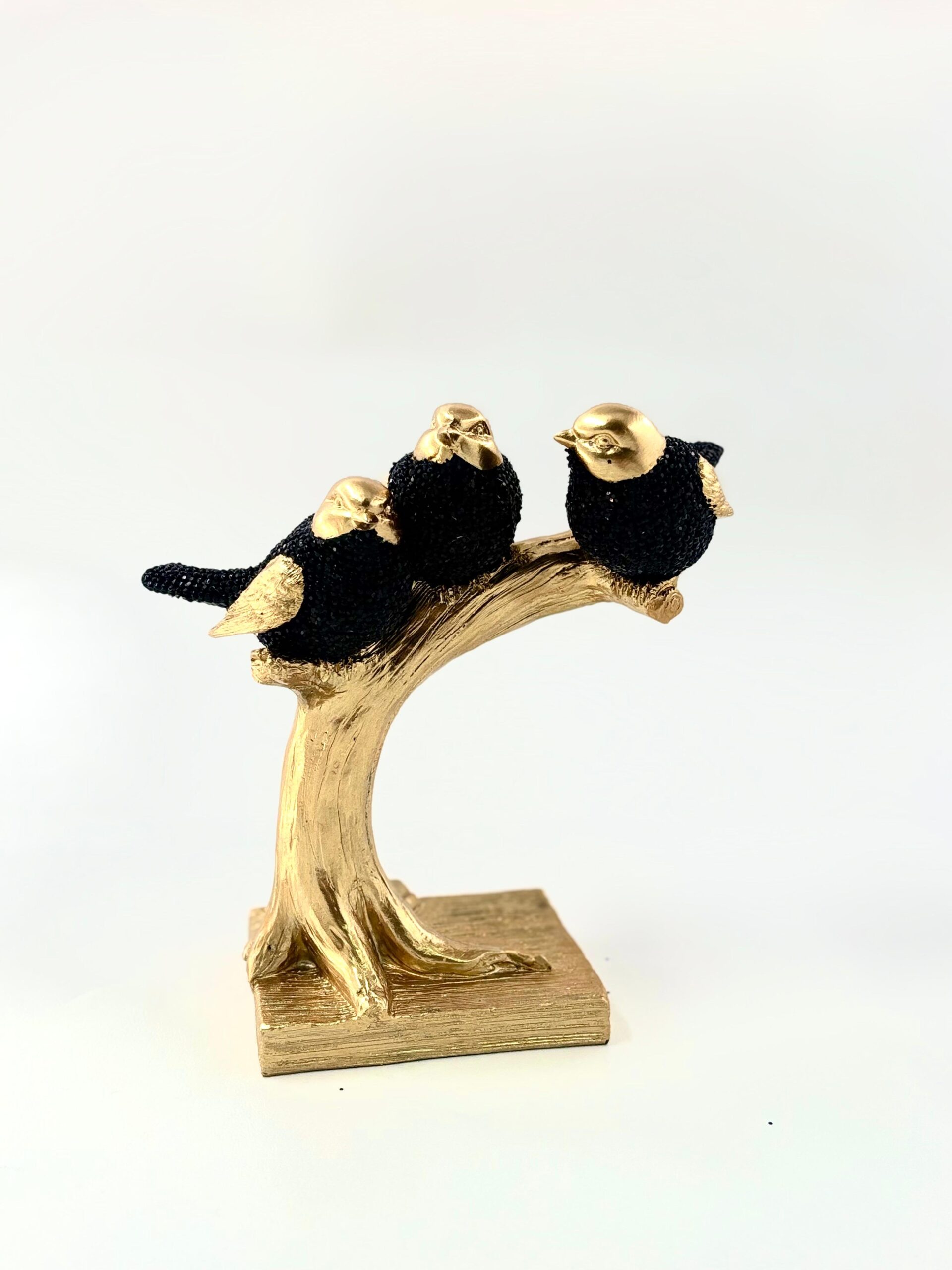 שלישיית יונים שחורים על ענף זהב מנצנץ